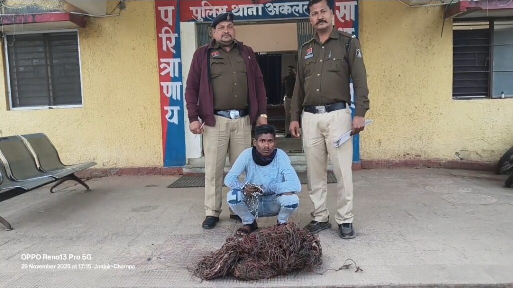 थाना अकलतरा पुलिस ने क्रेशर प्लांट में लगी तांबा तार की बड़ी चोरी का पर्दाफाश करते हुए मुख्य आरोपी और चोरी के माल के खरीदार दोनों को गिरफ्तार कर लिया है। प्रार्थी मुकेश कुमार जैन, निवासी अकलतरा ने रिपोर्ट दर्ज कराई थी कि किरारी स्थित क्रेशर प्लांट में लगे केबल तार, सर्विस तार और तांबा तार लगभग 400 मीटर सहित क्षेत्र के अन्य 5 क्रेशर मालिकों के प्लांट में लगे कुल 1520 मीटर तांबा तार को 25-26 नवंबर की दरम्यानी रात अज्ञात चोरों ने चोरी कर लिया है।