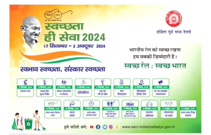भारतीय रेलवे द्वारा इस वर्ष स्वच्छ भारत मिशन के शुभारंभ की 10वीं वर्षगांठ के उपलक्ष्य में स्वभाव स्वच्छता, संस्कार स्वच्छता थीम के साथ स्वच्छता ही सेवा अभियान 17 सितम्बर से 2 अक्टूबर तक मनाया गया।इसके तहत 17 सितम्बर से 2 अक्टूबर 2024 तक आयोजित इस स्वच्छता ही सेवा अभियान में दक्षिण पूर्व मध्य रेलवे के सभी स्टेशनों, रेलवे परिसरों, पटरियों, कार्य क्षेत्रों तथा गाडियों में प्रत्येक दिवसों के थीम के अनुसार विभिन्न कार्यक्रमों का आयोजन किया गया।इसी कड़ी में दक्षिण पूर्व मध्य रेलवे में अलग अलग तकरीबन 15सौ 65 कार्यक्रम आयोजित किए गए।जिनमें 733 स्वच्छता में जन भागीदारी, 777 स्वच्छता लक्षित इकाई और 55 सफाई मित्र सुरक्षा शिविर शामिल है