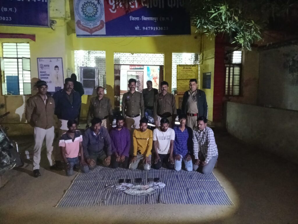 कोनी थाना क्षेत्र में अवैध जुआ-सट्टा के खिलाफ चलाए जा रहे ऑपरेशन “प्रहार” के तहत कोनी पुलिस ने बड़ी सफलता हासिल की है। मुखबिर सूचना पर देवनगर स्थित एक मकान में रेड कार्रवाई कर 52 पत्ती ताश से संगठित रूप से जुआ खेलते और खिलाते हुए 7 आरोपियों को रंगे हाथों गिरफ्तार किया गया।पुलिस ने मौके से ₹71,850 नगद, 2 बंडल ताश, प्लास्टिक कारपेट, 5 मोबाइल फोन और 3 मोटरसाइकिल जप्त की है। जप्त मशरूका की कुल अनुमानित कीमत लगभग ₹2.21 लाख बताई गई है। आरोपियों के खिलाफ छत्तीसगढ़ जुआ प्रतिषेध अधिनियम 2022 एवं भारतीय न्याय संहिता के तहत अपराध दर्ज किया गया है।पुलिस के अनुसार गिरफ्तार आरोपियों के विरुद्ध पूर्व में भी जुआ एक्ट के प्रकरण दर्ज हैं। सभी आरोपियों को विधिवत गिरफ्तार कर न्यायालय में पेश किया जाएगा। इस कार्रवाई में थाना प्रभारी कोनी निरीक्षक भावेश शेंडे सहित पुलिस टीम की सराहनीय भूमिका रही।