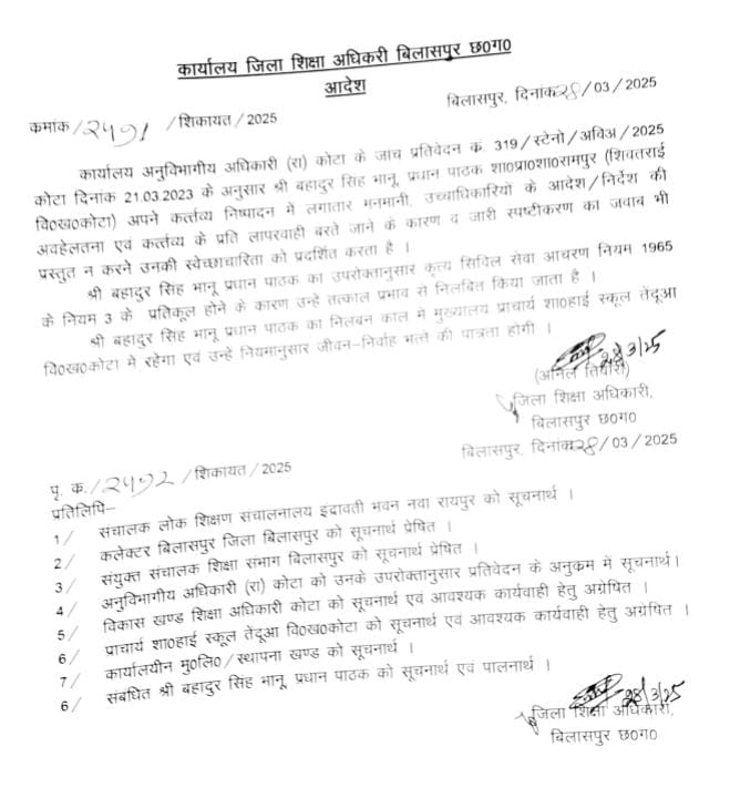 शिक्षा विभाग में अनुशासनहीनता और लापरवाही बर्दाश्त नहीं की जाएगी। इसी कड़ी में जिला शिक्षा अधिकारी ने सोमवार को शिवतराई के प्रधान पाठक बहादुर सिंह को निलंबित कर दिया। यह कार्रवाई एसडीएम कोटा की रिपोर्ट के आधार पर की गई है। बताया जा रहा है कि प्रधान पाठक काम में लापरवाही और मनमानी कर रहे थे, जिसकी लगातार शिकायतें जिला शिक्षा विभाग तक पहुंच रही थीं।शिक्षा विभाग को लगातार मिल रही शिकायतों के मद्देनजर जांच कराई गई, जिसमें लापरवाही की पुष्टि होने पर निलंबन का आदेश जारी किया गया। अधिकारियों का कहना है कि विभाग शिक्षकों की कार्यशैली पर कड़ी नजर रख रहा है, और अनुशासनहीनता बर्दाश्त नहीं की जाएगी।गौरतलब है कि पिछले दिनों भी जिला शिक्षा विभाग ने इसी तरह की सख्त कार्रवाई की थी, जिससे शिक्षा व्यवस्था में सुधार लाने का प्रयास किया जा रहा है।विभागीय अधिकारियों का मानना है कि इस तरह की कार्रवाई से शिक्षा विभाग में अनुशासन बढ़ेगा और शिक्षक अपने कर्तव्यों का बेहतर तरीके से निर्वहन करेंगे।
