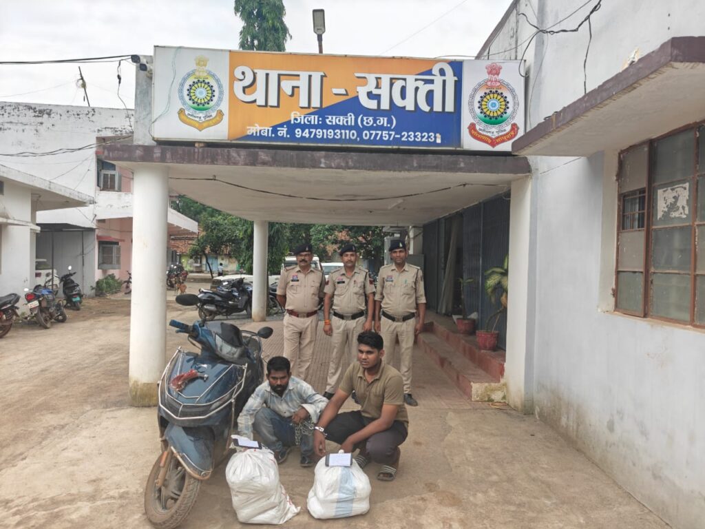 सक्ती पुलिस को मुखबीर की सूचना मिली कि स्कुटी वाहन में दो व्यक्ति गांजा लेकर रायगढ तरफ से सक्ती की ओर आ रहा है।जिसके बाद पुलिस ने मसनिया चौक नेशनल हाईवे रोड पंहुचकर घेराबंदी किया। जो कुछ देर बाद मुखबीर द्वारा बताये अनुसार एक बिना नंबर का टीव्हीएस जुपिटर स्कुटी में बैठे दो ब्यक्ति रायगढ तरफ से आते दिखाई दिये, जिन्हे घेराबंदी कर रोका गया, उक्त वाहन पर जिसमे दो ब्यक्ति सवार थे, जिनसे नाम व पता पूछने पर गुलाब देंवांगन सक्ती और उत्तम श्रीवास लैलुगा जिला रायगढ होना बताया। पूछताछ पर गुलाब देवांगन द्वारा स्कुटी के पीछे बैठे उत्तम श्रीवास निवासी लैलुगा से गांजा खरीदकर बिक्री करने लाना तथा घर तक छोडने साथ में आना बताया गया। मौके पर एनडीपीएस एक्ट के तहत कार्यवाही की गई।