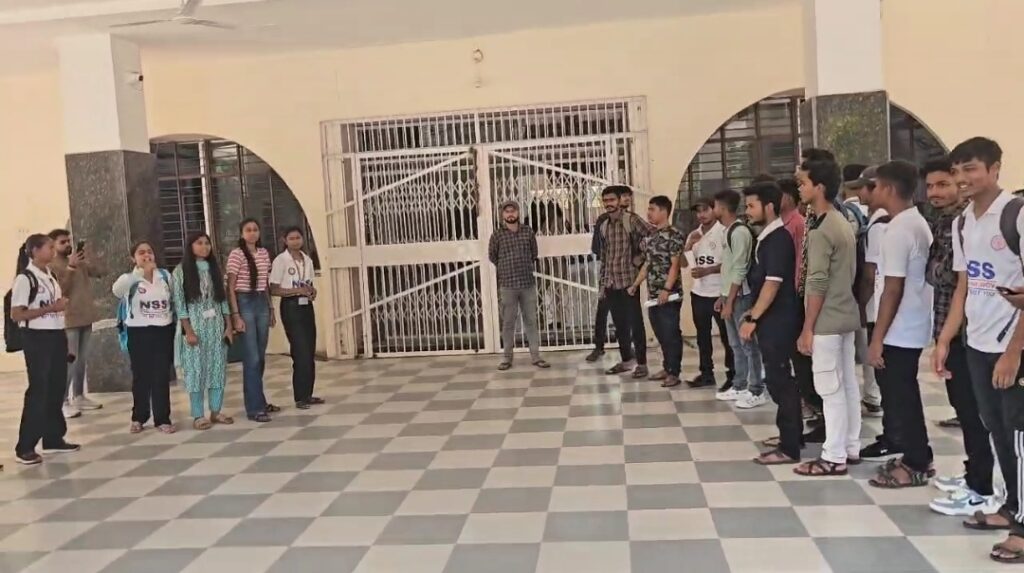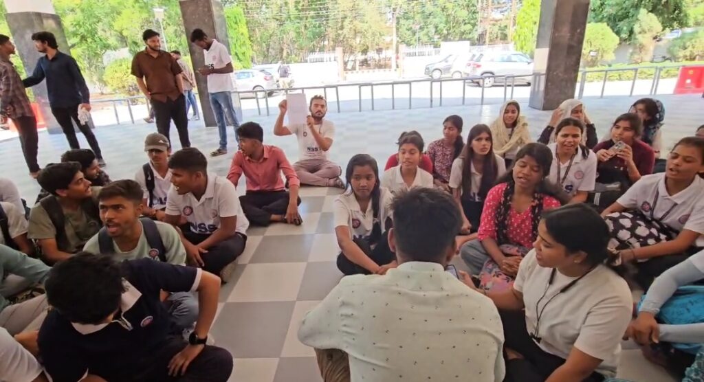 गुरुघासीदास सेंट्रल यूनिवर्सिटी नमाज विवाद ,प्रोफेसर दिलीप झा के सपोर्ट में आए NSS के छात्र NSS छात्रों ने प्रोफेसर झा के सपोर्ट में किया प्रदर्शन यूनिवर्सिटी के प्रशासनिक भवन के सामने किया गया प्रदर्शन