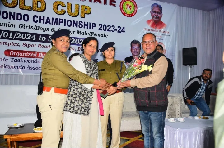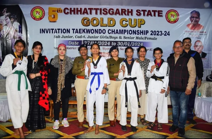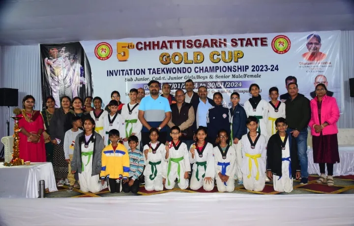 छत्तीसगढ़ राज्य ताइक्वांडो संघ, बिलासपुर द्वारा अयोजित 5वी छत्तीसगढ़ राज्य स्तरीय स्वर्ण आमंत्रण ताइक्वांडो प्रतियोगिता का आज तीसरा दिन संपन्न हुआ, जिसमें 28 एवं 29 जनवरी को कैडेट वर्ग के बालक/बालिका के विजेता खिलाड़ियों को मैडल प्रदान किया गया ।छत्तीसगढ़ राज्य ताइक्वांडो संघ के महासचिव श्री रामपुरी गोस्वामी ने उपरोक्त जानकारी देते हुए बताया कि 29 जनवरी के पदक वितरण समारोह के मुख्य अतिथि अतिरिक्त पुलिस अधीक्षक स्पेशल ब्रांच श्रीमती दीपमाला कश्यप , कार्यक्रम अध्यक्षता अतिरिक्त पुलिस अधीक्षक श्रीमती अर्चना झा एवम विशिष्ठ उप पुलिस अधीक्षक श्रीमती मंजुलता केरकेट्टा और रक्षित निरीक्षक पुलिस लाइन श्री भूपेंद्र गुप्ता जी, रहे है। सभी अतिथियों द्वारा उद्बोधन में जीते हुवे खिलाड़ियों को बधाई और पराजित खिलाड़ियों को निराश ना हो कर खूब मेहनत करने की बात कही गई। प्रति वर्ष ताइक्वांडो प्रतियोगिता का आयोजन करने पर छत्तीसगढ़ राज्य ताइक्वांडो संघ के समस्त पदाधिकारियों शुभकामनाएं प्रेषित किए।प्रतियोगिता में कैडेट वर्ग वर्ग के 20 वेट केटेगरी एवं सब जुनियर वर्ग के 04, वेट कैटेगरी में 78 मैडल का वितरण किया गया।प्रतियोगिता में राज्य के विभिन्न जिलों से 475 खिलाड़ी एवं 60 आफिशियल भाग लिए हैं। परिणाम निम्नानुसार हैं= 33 किलोग्राम में स्वर्ण पदक मानसी पटेल रायगढ़, रजत पदक आकांक्षा धनकर बिलासपुर, 37 किलोग्राम में स्वर्ण पदक वैष्णवी चंद्रा बिलासपुर, रजत पदक अरिशिता ताम्रकार बिलासपुर, कांस्य पदक मधुरिमा निषाद रायपुर, प्रख्या डोंगरे बिलासपुर, 41किलोग्राममें प्रज्ञा यादव स्वर्ण पदक, सान्या महंत जशपुर, कांस्य पदक सौम्या साहू रायगढ़, मिया अल्ताफ कोरबा, 44किलोग्राम में स्वर्ण पदक अल्बिना शाकिल बिलासपुर, रजत पदक आर्ची गाडगे दुर्ग कास्य पदक अन्याय जांजगीर चांपा, आराध्या सिंह विलासपुर,74किलोग्राम में स्वर्ण पदक मिष्ठी नागेश बिलासपुर, रजत पदक अफ्शा जी पी एम, कांस्य पदक कुमकुम दुर्ग, कनिका पवार बिलासपुर, 51किलोग्राम में स्वर्ण पदक परी सिद्दाम बिलासपुर, रजत पदक आरना सुराना बिलासपुर, कास्य पदक प्रिंसी सिंह , अर्पिता आदित्य रायगढ़,59 किलोग्राम में स्वर्ण पदक तुलिका गड़ेवाल दुर्ग, रजत पदक प्रज्ञा मिश्रा बिलासपुर, कांस्य पदक रुचिका केवट रायपुर,59 किलोग्राम के ऊपर वेट मे स्वर्ण पदक दक्षा श्रीवास कोरबा। एवम सब जुनियर वर्ग में 29किलोग्राम में स्वर्ण पदक छायांक वर्मा बिलासपुर, रजत पदक के रिसिट कोरबा, कास्य पदक पार्थ बाजपेयी बिलासपुर रक्षित साहू बिलासपुर, 32किलोग्राम में स्वर्ण पदक कान्हा यादव बिलासपुर, रजत पदक वैदिक गुप्ता बिलासपुर, कांस्य पदक कलश केवंट बिलासपुर, प्रयान चंद्राकर दुर्ग,38 किलोग्राम मे