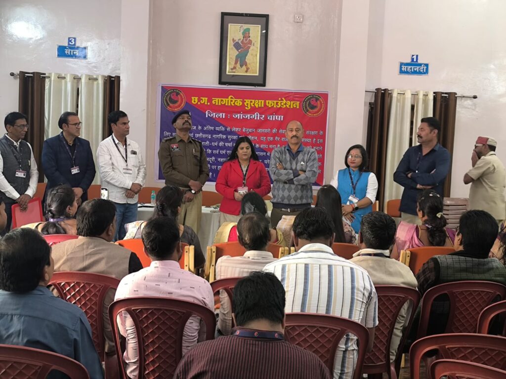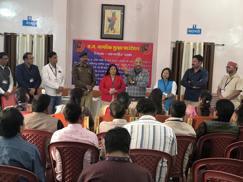जांजगीर-चांपा में छत्तीसगढ़ नागरिक सुरक्षा फाउंडेशन के शपथ ग्रहण समारोह में पुलिस अधीक्षक विजय कुमार पाण्डेय ने नागरिक सुरक्षा को सामूहिक जिम्मेदारी बताते हुए नशाबंदी, काउंसलिंग और सामाजिक समन्वय की आवश्यकता पर जोर दिया। उन्होंने कहा कि समाज की सुरक्षा सिर्फ शारीरिक नहीं, बल्कि मानसिक और नैतिक स्तर पर भी जरूरी है। एसपी ने पुलिस बल की सीमित संख्या का उल्लेख करते हुए नागरिक संगठन को विवाद समाधान, पीड़ित सहायता और जागरूकता गतिविधियों में सक्रिय भूमिका निभाने की प्रेरणा दी।