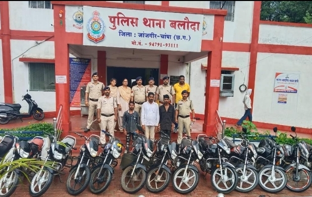 जिला पुलिस जांजगीर चांपा द्वारा अपराधियों के खिलाफ सख्त कार्रवाई की जा रही है। थाना बलौदा में मोटर सायकल चोरी की सूचना रिपोर्ट पर अपराध पंजीबद्ध कर विवेचना में लिया जाकर चोरी गए मोटर सायकल एवं आरोपियों कि पतासाजी की जा रही थी। इसी क्रम में SDOP प्रदीप कुमार सोरी के नेतृत्व में जरिये मुखबिर सूचना पर ग्राम पडरिया निवासी कोंदा गोंड उर्फ अनिल एवं पिंन्टु साहु को पुलिस हिरासत में लेकर मोटर सायकल चोरी के संबंध में पूछताछ करने पर बताया कि सब्जी मार्केट बलौदा से एचएफ डिलक्स को दोनो साथ मिलकर चोरी करना बताए तथा पुलिस द्वारा कडाई से पूछताछ करने पर जांजगीर, बिलासपुर, कोरबा एवं अन्य जगहो से घूम-घूम कर और भी 14 नग मोटर सायकल चोरी करना बताया और चोरी के मोटर सायकल को अपने कब्जे में छिपाकर रखना एवं एक मोटर सायकल को शंकर धनुहार निवासी कोटगढ को बिक्री करना बताए इस प्रकार आरोपियों के कब्जे से कुल 15 नग किमती 6,45,000 रू को बरामद कर आरोपियों को विधिवत गिरफ्तार कर न्यायिक रिमांड पर भेजा गया है।