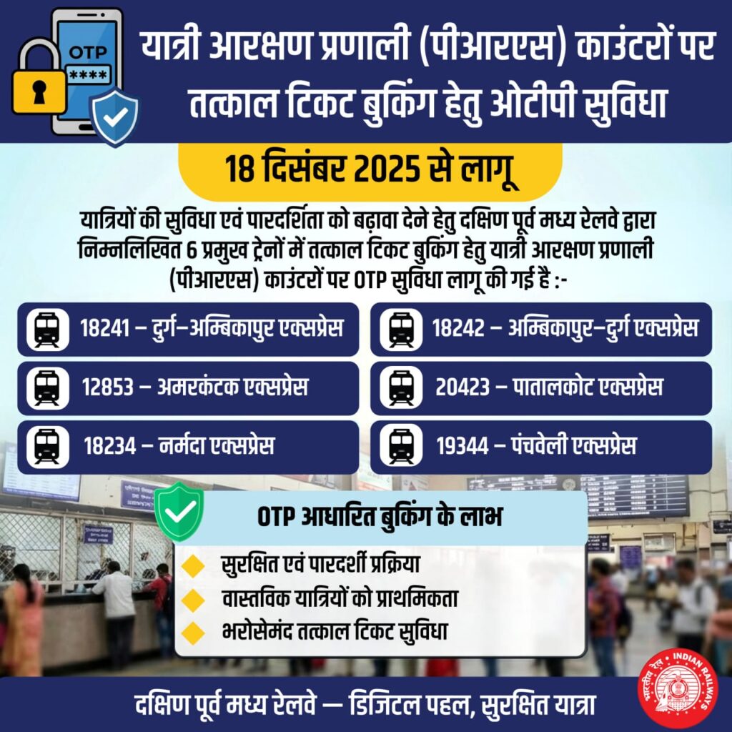 तत्काल टिकट बुकिंग में पारदर्शिता लाने और दलालों की भूमिका खत्म करने के लिए रेलवे ने बड़ा डिजिटल कदम उठाया है। अब पीआरएस काउंटरों से तत्काल टिकट केवल OTP आधारित प्रणाली से ही जारी होंगे। यह नई व्यवस्था 18 दिसंबर 2025 से लागू कर दी गई है। रेलवे ने यात्री आरक्षण प्रणाली यानी पीआरएस काउंटरों पर तत्काल टिकट बुकिंग के लिए OTP सिस्टम शुरू किया है। अब यात्री के आधार से जुड़े मोबाइल नंबर पर OTP आएगा, जिसे सत्यापित करने के बाद ही टिकट जारी किया जाएगा।रेलवे अधिकारियों के मुताबिक इस व्यवस्था का मकसद फर्जी बुकिंग, साइबर फ्रॉड और एजेंटों की दखलअंदाजी पर रोक लगाना है। लंबे समय से शिकायतें मिल रही थीं कि दलाल तकनीकी गड़बड़ियों और फर्जी आईडी के जरिए तत्काल टिकटों पर कब्जा कर लेते हैं।सीनियर डीसीएम ने बताया कि OTP सिस्टम एक तरह की सिंगल और टू-फैक्टर सुरक्षा व्यवस्था है। इससे यह सुनिश्चित होगा कि केवल वास्तविक यात्री ही तत्काल टिकट बुक कर सकें और फर्जी अकाउंट पूरी तरह रोके जा सकें। रेलवे के अनुसार OTP के बिना किसी भी यात्री को पीआरएस काउंटर से तत्काल टिकट जारी नहीं किया जाएगा। यात्रियों का कहना है कि इस नई व्यवस्था से तत्काल टिकट मिलने की संभावना बढ़ेगी और एजेंटों की मनमानी पर प्रभावी रोक लगेगी।