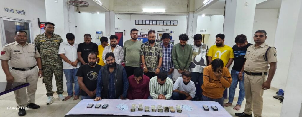 बिलासपुर एसपी रजनेश सिंह के निर्देश पर जुआरियों पर प्रहार करते हुए एसीसीयू और तार बाहर पुलिस ने 17 जुआरियों को गिरफ्तार किया है। जुआरियों से ताश पत्ती और 3 लाख 45 हजार रुपये नगद जप्त भी किया गया है।एसीसीयू और तारबाहर पुलिस को मुखबिर से सूचना मिली कि थाना तारबाहर के क्रांति नगर स्थित एक मकान में बड़ा जुआ चल रहा है।जहां जुआरी ताश पत्ती पर जीत हार का दांव खेला रहे है।तत्काल पुलिस ने दल बल के साथ मकान में दबिश देकर देव प्रसाद कौशिक,,कैलाश घोरे,, कपिल चंदवानी,,आशु कौशिक,,पारस पुरुषवानी,,रोशन चंदवानी,,शुभम गोत्रे,, राजेश गुप्ता,,रितेश बंजारा,,सुखदेव भार्गव,,रामेश्वर गुप्ता,,रवि गोयल,,नितिन तिवारी,,देवांश मूर्ति,,आयुष अग्रवाल,, सुमित महाजन और मुकेश गुप्ता को गिरफ्तार किया है। मामले में आरोपियों के खिलाफ वैधानिक कार्यवाही की जा रही है।