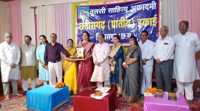 तुलसी साहित्य अकादमी छत्तीसगढ़ प्रांतीय इकाई के तत्वावधान में रविवार को एक भव्य समारोह का आयोजन किया गया, जिसमें समाज सेवा, साहित्य और राजनीति के क्षेत्र में विशिष्ट योगदान देने वाले प्रतिभाशाली व्यक्तियों को सम्मानित किया गया। यह समारोह छत्तीसगढ़ की साहित्यिक और सांस्कृतिक समृद्धि को बढ़ावा देने के उद्देश्य से आयोजित किया गया था सम्मान समारोह के इस खास अवसर पर सुप्रसिद्ध विदुषी डॉ. पुष्पा दीक्षित को विशेष रूप से सम्मानित किया गया। डॉ. दीक्षित ने पाणिनी पर महत्वपूर्ण शोध कार्य किया है और उन्हें राष्ट्रपति द्वारा भी पुरस्कृत किया जा चुका है। उनके इस अभूतपूर्व योगदान को सम्मानित करते हुए अकादमी ने उन्हें विशेष पुरस्कार प्रदान किया।इसके अलावा, शंकर यादव को राजनीति में शुचिता बनाए रखने और समाज के प्रति उनकी निष्ठा के लिए सम्मानित किया गया। वहीं, समाज सेवा और साहित्यिक संस्कृति से गहरा जुड़ाव रखने वाली डॉ. स्मृति वैष्णव जैन को भी ‘समाज साधना पुरस्कार’ से नवाजा गया। रायगढ़ से बलराम शर्मा को उनके सतकर्म और समाज में जागरूकता अभियान के लिए सम्मानित किया गया।कार्यक्रम में शिव प्रताप साव को भी विशेष रूप से सम्मानित किया गया। इस अवसर पर उनके पिता अमरनाथ साव भी अतिथि के रूप में उपस्थित रहे, जिससे समारोह की गरिमा और बढ़ गई।हिंदी और छत्तीसगढ़ी के सुप्रसिद्ध कवि शरद तिवारी को भी साहित्य के क्षेत्र में उनके योगदान के लिए विशेष सम्मान दिया गया। इसके अतिरिक्त, नेपाल से ब्रांड एंबेसडर के रूप में बिलासपुर की डॉ. प्रीति प्रसाद, रत्नावली सम्मान, भोपाल से डॉ. आभा गुप्ता, डॉ. किरण राठौड़ और कई अन्य शिक्षाविदों तथा समाजसेवियों को भी सम्मानित किया गया।कार्यक्रम के दौरान एक विशेष पुस्तक विमोचन भी संपन्न हुआ। इस अवसर पर छत्तीसगढ़ी बाल कहानियों और राम-केंद्रित भजनों पर आधारित दो पुस्तकों का विमोचन किया गया, जिनके लेखक रमज़ा सीतल, पाटन वार और राजपूत हैं। पुस्तक विमोचन के बाद काव्य गोष्ठी का आयोजन भी हुआ, जिसमें साहित्यकारों ने अपनी रचनाओं का वाचन किया।तुलसी साहित्य अकादमी द्वारा आयोजित यह कार्यक्रम बिलासपुर में अपने ढंग का एक वार्षिक समारोह माना जाता है, जो समाज और साहित्य के क्षेत्र में योगदान देने वालों को मंच प्रदान करता है। इस वर्ष के आयोजन में एक विशेष सांस्कृतिक संध्या का भी आयोजन किया गया, जिसमें समाज सेवा के क्षेत्र में महत्वपूर्ण योगदान देने वाली डॉ स्मृति जैन को ‘समाज साधना पुरस्कार’ से सम्मानित किया गया। सम्मान समारोह में यूं तो सभी ने अपने अपने विचार व्यक्त किये,,आयोजनकर्ताओं का सरहना भी किया।इसी तरह इस अवसर पर अपने विचार व्यक्त करते हुए डॉ. स्मृति वैष्णव जैन ने भी क