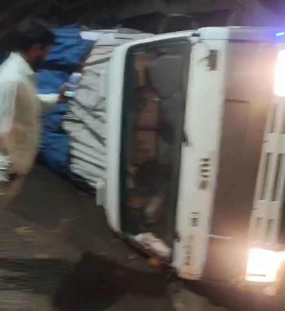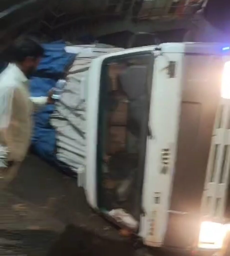तेज रफ्तार माजदा पलटी, बड़ा हादसा टला; रेलवे की लापरवाही से मंडरा रहा खतरा,छोटे वाहनों के लिए बने अंडरब्रिज से गुजर रहे भारी वाहन, नहीं लगी ऊंचाई रोकने वाली बाधा