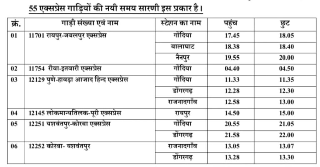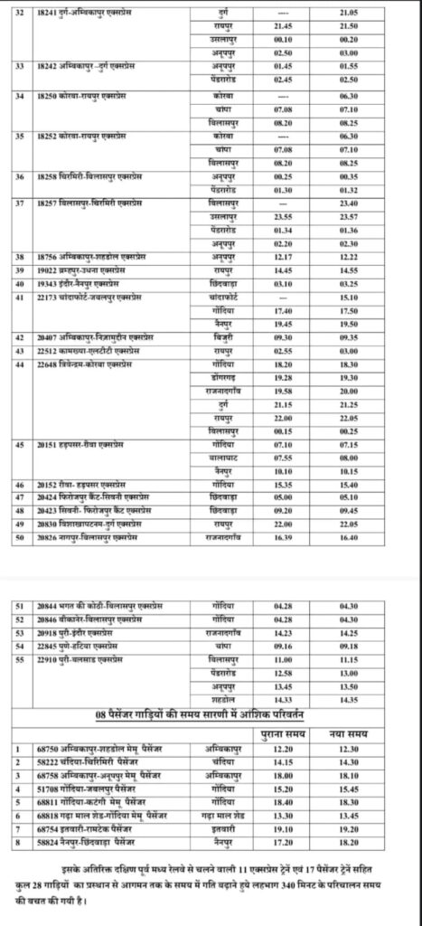 इस बार बिलासपुर जोन से होकर चलने वाली और गुजरने वाली कुल 63 गाड़ियों—जिसमें अप और डाउन दिशा की 55 एक्सप्रेस तथा 8 पैसेंजर ट्रेनें शामिल हैं—के समय में आंशिक परिवर्तन किया गया है, जबकि अन्य ट्रेनों का समय यथावत रहेगा।