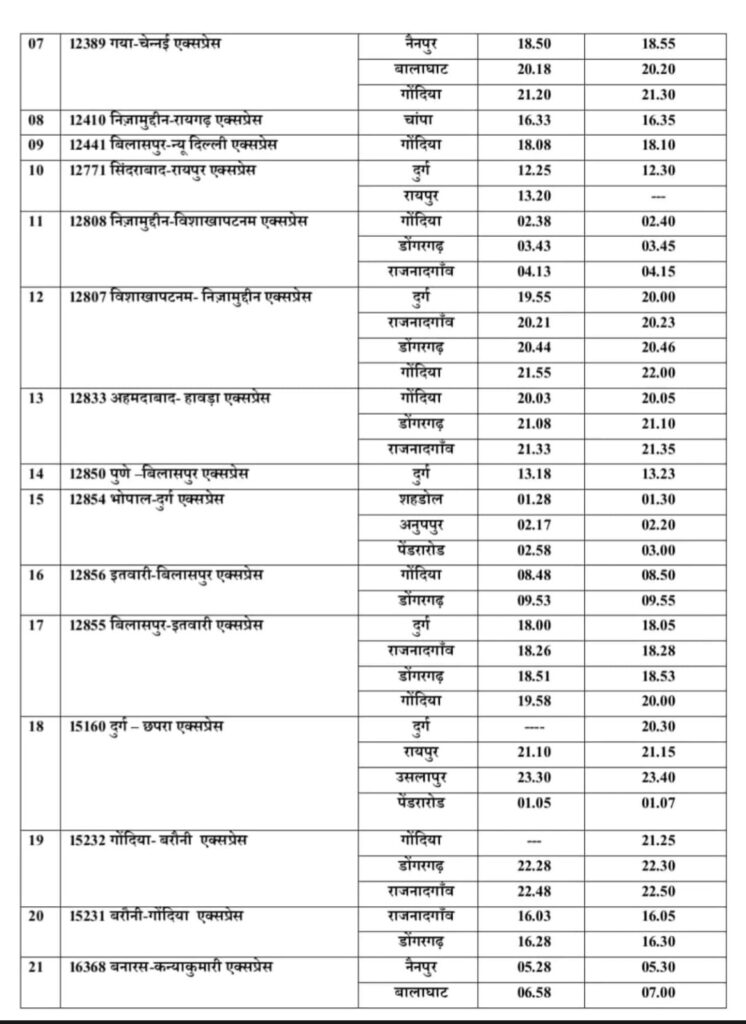 यात्री अपने संबंधित स्टेशन, रेलवे पूछताछ केंद्र या रेलवे की अधिकृत वेबसाइट से अपडेटेड टाइम-टेबल देखकर ही यात्रा की योजना बनाएं, ताकि किसी तरह की असुविधा न हो।दक्षिण पूर्व मध्य रेलवे के अनुसार हर वर्ष विभिन्न स्टेशनों पर इन्फ्रास्ट्रक्चर विकास कार्यों के चलते समय-सारणी में बदलाव किया जाता है।