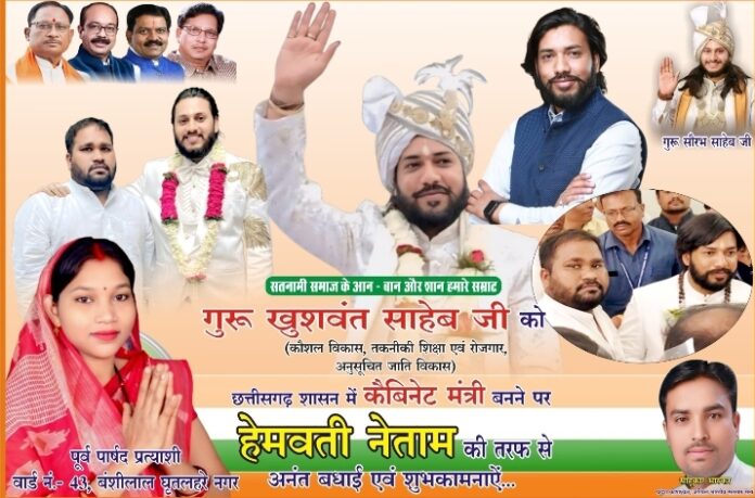 छत्तीसगढ़ शासन के नवनिर्वाचित मंत्री गुरु सुखवंत साहेब जी कौशल विकास, तकनीकी शिक्षा एवं रोजगार, अनुसूचित जाति विकास व छत्तीसगढ़ शासन के कैबिनेट मंत्री बनने पर हेमवती नेताम और दीपक बंजारे की ओर से छत्तीसगढ़ शासन के मंत्री गुरु सुखवंत साहेब जी को बहुत बहुत बधाई और शुभकामनाएं।