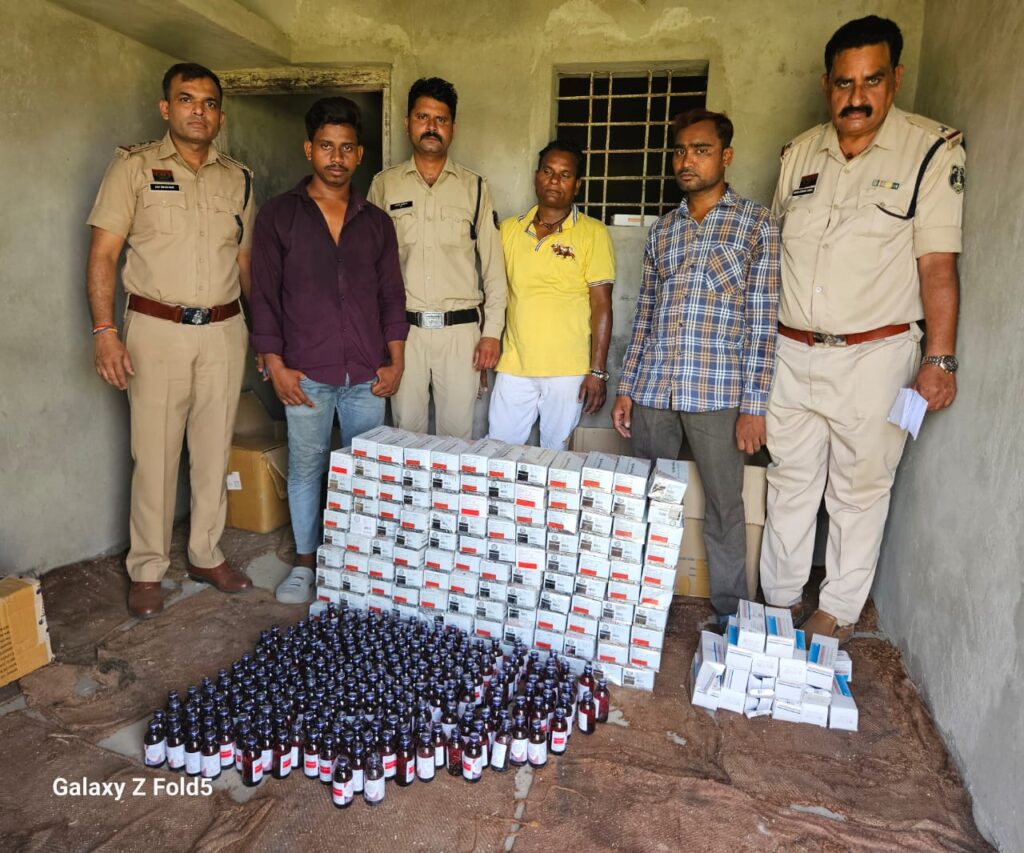 पुलिस टीम को मुखबिर से सूचना मिली कि एक व्यक्ति रेल्वे ब्रिज के नीचे बेलदारपारा चांपा में अवैध रूप से नशीली दवा बेच रहा है।इसके बाद पुलिस की टीम मौके पर पहुंची।जहां एक व्यक्ति पुलिस टीम को देखकर भागने के फिराक में था।लेकिन पुलिस ने घेराबंदी कर उसे पकड लिया।उसकी तलाशी लेने पर पुलिस को थैला मिला जिसमें अवैध नशीली कफ सिंरफ PRIKOF -T, 120 नग तथा नशीली टेबलेट pyeevon Spas plus कुल 4,328 नग मिला जिसे विधिवत जप्त किया गया।पूछताछ के दौरान पकड़े गए व्यक्ति अविनाश यादव ने बताया कि वह नशीली पदार्थो जांजगीर के दुर्गेश यादव के साथ मिलकर बेचता हैं ।इस पर तत्काल पुलिस टीम के द्वारा दुर्गेश यादव के मकान पर रेड कार्यवाही किया गया जो दुर्गेश यादव के कब्जे से नशीला कफ सिंरफ PRIKOF -T, 240 नग तथा नशीला टेबलेट Pyeevon Spas plus कुल 28,560 नग टेबलेट तथा नशीली टेबलेट Spasmo- proxyvin plus कुल 2,592 नग बरामद हुआ, इस तरह पुलिस टीम के द्वारा दोनो आरोपियो के कब्जे से अवैध नशीली सिरफ कुल 360 नग तथा अवैध नशीली टेबलेट कुल 35,480 नग कुल कीमत 4,08,362/ रू को जप्त किया गया। दोनो आरोपियो पर NDPS ACT के तहत गिरफ्तार कर वैधानिक कार्यवाही किया जा रहा है।