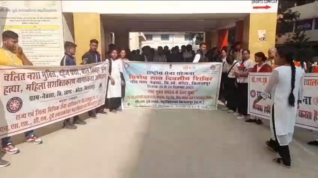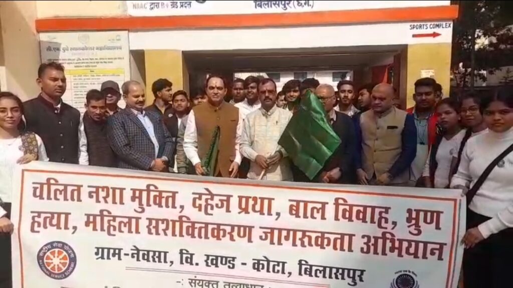 राष्ट्रीय सेवा योजना के अंतर्गत गोद ग्राम नेवसा, विकासखंड कोटा, जिला बिलासपुर में 20 से 26 दिसंबर तक विशेष सात दिवसीय शिविर का आयोजन किया जा रहा है। इस शिविर की थीम “नशा मुक्त समाज के लिए युवा” रखी गई है। शिविर के माध्यम से बैगा एवं गौड़ आदिवासी समुदाय के बीच नशा मुक्ति, घरेलू हिंसा, लैंगिक समानता, स्वच्छता और सामाजिक जागरूकता से जुड़े विषयों पर अभियान चलाया जाएगा।