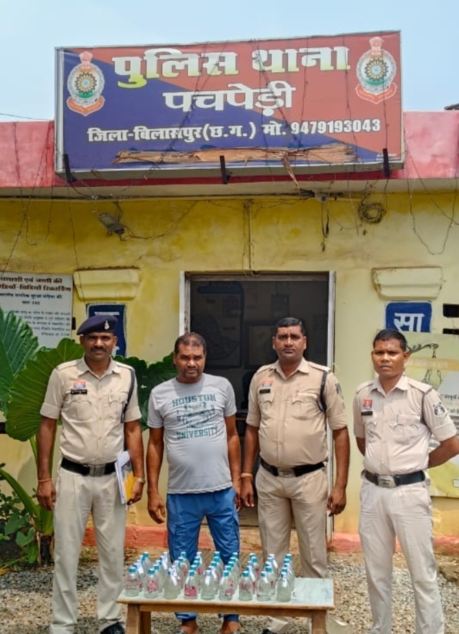 बिलासपुर :- बिलासपुर पुलिस ने नशा मुक्ति और प्रहार अभियान के तहत पचपेड़ी क्षेत्र में बड़ी कार्रवाई की है।पुलिस ने पतईडीह मोड़ निवासी विद्या चरण पाटले के कब्जे से 40 पाव देशी प्लेन शराब जब्त की है। आरोपी को गिरफ्तार कर न्यायालय में पेश किया गया।जानकारी के अनुसार वरिष्ठ पुलिस अधीक्षक रजनेश सिंह ने जिले में अवैध शराब कारोबार पर सख्त कार्रवाई के निर्देश दिए थे। अतिरिक्त पुलिस अधीक्षक अर्चना झा और एसडीओपी मस्तूरी लालचंद मोहल्ले के मार्गदर्शन पर थाना प्रभारी श्रवण कुमार ने टीम गठित कर अभियान चलाया।पेट्रोलिंग के दौरान पुलिस को मुखबिर से सूचना मिली कि आरोपी विद्या चरण पाटले अपने घर के आंगन में अवैध देशी मदिरा छिपाकर बिक्री की तैयारी कर रहा है। इस पर पुलिस टीम ने तत्काल घेराबंदी कर आरोपी के कब्जे से शराब की खेप बरामद की। पुलिस ने आरोपी को 16 अगस्त 2025 को गिरफ्तार कर न्यायालय में पेश किया।