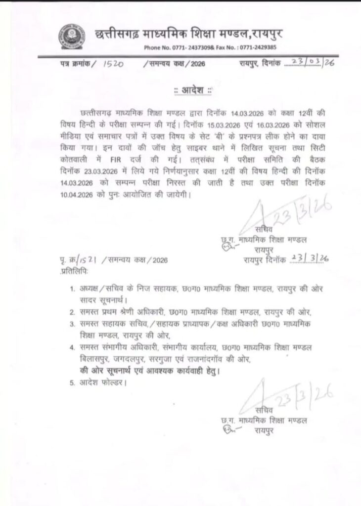 छत्तीसगढ़ माध्यमिक शिक्षा मंडल ने कक्षा 12वीं की हिंदी विषय की परीक्षा को निरस्त कर दिया है। मंडल द्वारा जारी आदेश के अनुसार 14 मार्च को आयोजित यह परीक्षा अब रद्द मानी जाएगी और इसे पुनः आयोजित किया जाएगा। यह निर्णय परीक्षा प्रश्नपत्र लीक होने की आशंका के चलते लिया गया है। मिली जानकारी के अनुसार 15 और 16 मार्च को सोशल मीडिया मे सेट बी के प्रश्नपत्र लीक होने के दावे सामने आए थे। इन दावों को गंभीरता से लेते हुए मामले की जांच के लिए साइबर थाने में लिखित सूचना दी गई। परीक्षा समिति की 23 मार्च को आयोजित बैठक में पूरे मामले की समीक्षा की गई। जांच और उपलब्ध तथ्यों के आधार पर समिति ने 14 मार्च को हुई हिंदी परीक्षा को निरस्त करने का निर्णय लिया। मंडल ने स्पष्ट किया है कि परीक्षा की निष्पक्षता बनाए रखने के लिए यह कदम उठाया गया है। मंडल के आदेशानुसार अब कक्षा 12वीं की हिंदी विषय की पुनः परीक्षा 10 अप्रैल को आयोजित की जाएगी। छात्रों को सलाह दी गई है कि वे नई तिथि के अनुसार अपनी तैयारी जारी रखें। वहीं, मामले की जांच जारी है और दोषियों के खिलाफ सख्त कार्रवाई की बात कही गई है।