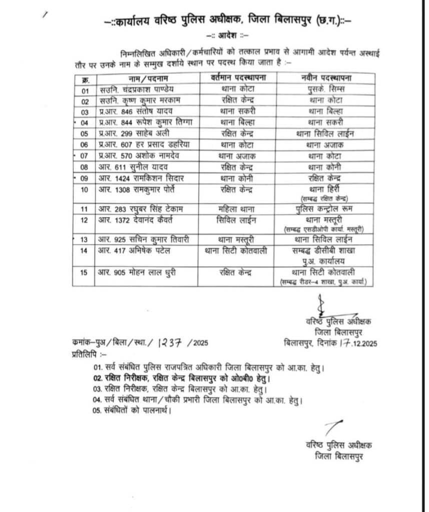 बिलासपुर पुलिस में प्रशासनिक बदलाव एसएसपी राजनेश सिंह के आदेश से 15 पुलिसकर्मियों के तबादले