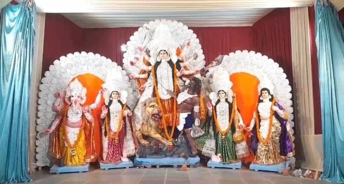 विधि विधान से दुर्गा पूजा का संकल्प लिया गया। कल्प आरंभ यानी अकाल बोधन के साथ ही घट स्थापना हो गई ।1923 से आरंभ बंगाली संगठन के इस बहुप्रतीक्षित पूजा में इस बार 60 फीट ऊंचे पंडाल का निर्माण किया गया है, जिसे रामकृष्ण परमहंस देव की जन्मस्थली कमरपुकुर के मंदिर का स्वरूप दिया गया है । कोलकाता के कारीगरों ने यह पांडाल तैयार किया है। सोमवार को पंचमी पर बोधन पूजा किया गया। मंगलवार को माता विराजमान होगी ।अधिवास पूजा के साथ दुर्गा उत्सव आरंभ होगा। 10 अक्टूबर को अष्टमी पर सुबह 6:24 से 7:14 तक संधि पूजा होगी। 11 को महानवमी पर हवन पूजन किया जाएगा तो वही 12 अक्टूबर को विजयदशमी पर महिलाएं सिंदूरदान कर एक दूसरे को सिंदूर लगाएंगी।