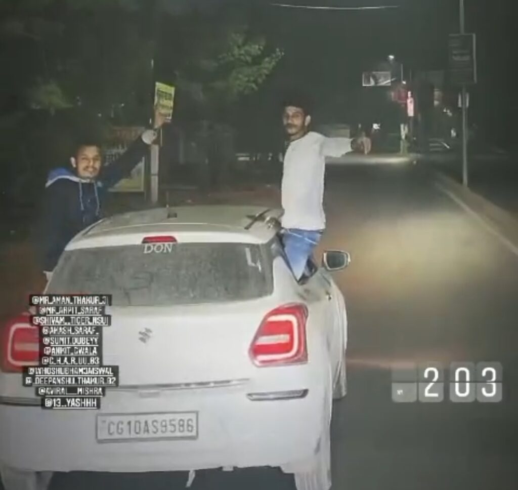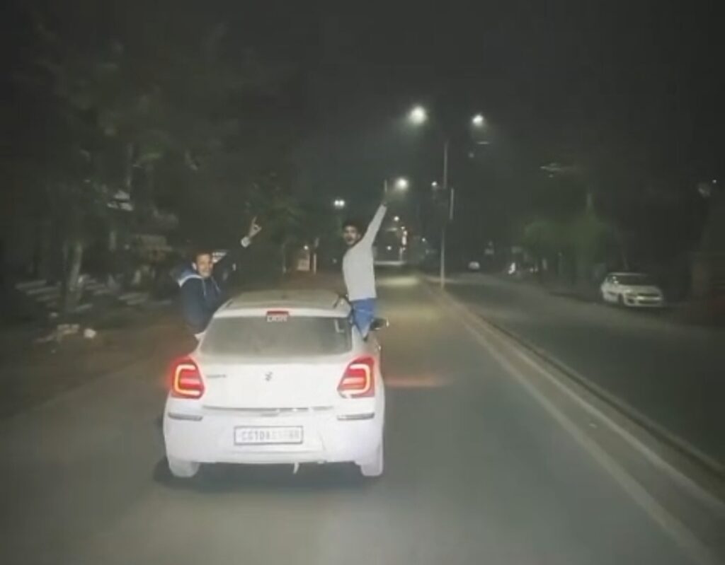 बिलासपुर में कुछ युवकों की कार पर स्टंटबाजी का वीडियो सोशल मीडिया पर तेजी से वायरल हो रहा है। वीडियो में युवक कार की खिड़की से बाहर निकलकर बैठते और लगातार सायरन बजाते हुए ट्रैफिक नियमों की खुली धज्जियां उड़ाते नजर आ रहे हैं। यह हरकत न सिर्फ उन्हें बल्कि आसपास चल रहे वाहनों को भी गंभीर खतरे में डाल रही थी।