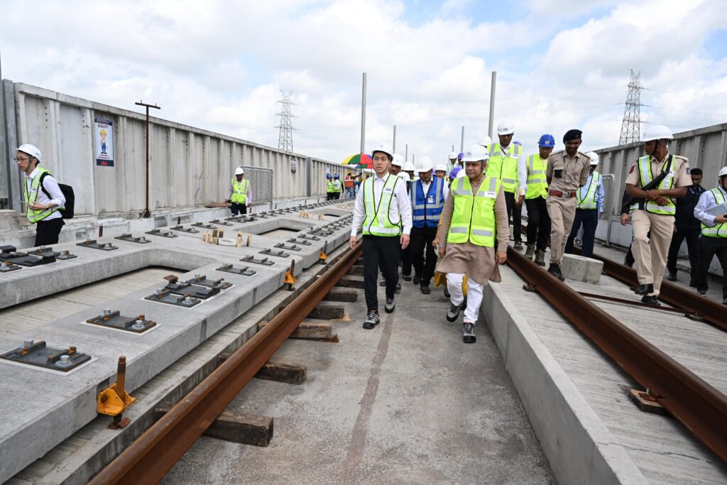 रेल मंत्री अश्विनी वैष्णव और जापान के परिवहन मंत्री हिरोमासा नाकानो ने आज मुंबई–अहमदाबाद हाई-स्पीड रेल कॉरिडोर के सूरत और मुंबई स्थलों का दौरा किया। सूरत एयरपोर्ट पर नाकानो का पारंपरिक गरबा से स्वागत हुआ, जिसमें सांसद, मेयर और वरिष्ठ अधिकारी उपस्थित रहे।मंत्रियों ने सूरत में ट्रैक स्लैब बिछाने और जे-स्लैब बैलास्टलेस ट्रैक प्रणाली की प्रगति देखी। वैष्णव ने हाल ही में पहले ट्रैक टर्नआउट की स्थापना का भी निरीक्षण किया था।