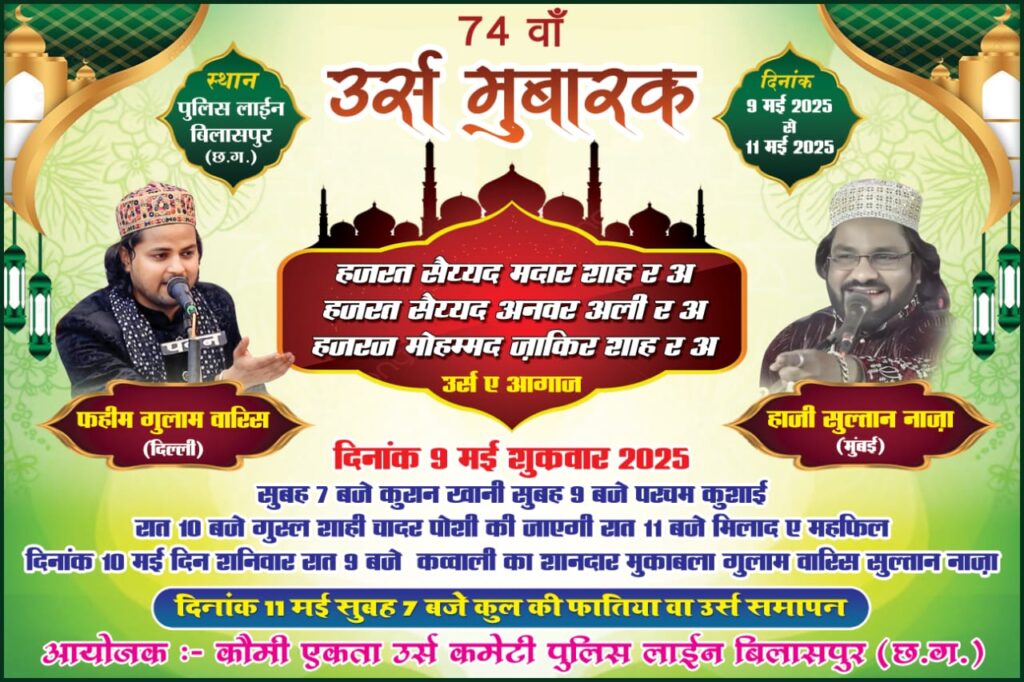 हर साल की तरह इस बार भी हज़रत सय्यद मदार शाह र.अ., हज़रत सय्यद अनवर अली र.अ. और हज़रत मोहम्मद ग़नी शाह र.अ. की याद में 74वां उर्स ए मुबारक पूरे अकीदत और अज़मत के साथ मनाया जा रहा है। 9 मई से 11 मई तक पुलिस लाइन, बिलासपुर स्थित दरगाह शरीफ में आयोजित होने वाला यह उर्स अब महज़ एक मज़हबी आयोजन नहीं बल्कि कौमी एकता, भाईचारे और इंसानियत का प्रतीक बन चुका है।यह दरगाह शरीफ अब सर्वधर्म श्रद्धालुओं की आस्था और मन्नत का केंद्र बन गई है। हर साल यहां बड़ी संख्या में विभिन्न मज़हबों के अकीदतमंद अपनी मुरादें लेकर हाज़िर होते हैं और मानते हैं कि सच्चे दिल से की गई दुआ यहां जरूर कुबूल होती है।