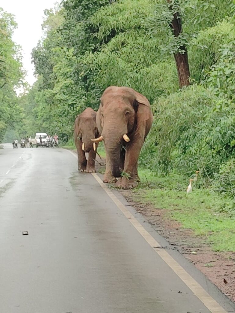 रायगढ़ शहर से लगे ओडिशा के मुख्य मार्ग पर ग्राम बंबूरसिया में दिखे दो हाथी,मुख्य सड़क पर एक मादा हाथी और एक शावक हाथी,