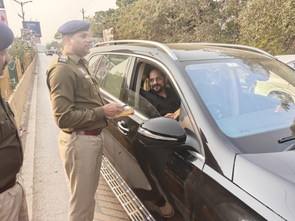 कार्यक्रम में हेलमेट का वितरण भी किया गया।पुलिस टीम ने लोगों को यातायात नियमों की जानकारी देते हुए जागरूकता पाम्पलेट बांटे। साथ ही चार पहिया वाहन चालकों को वाहन चलाते समय अनिवार्य रूप से सीट बेल्ट लगाने की समझाइश दी गई, ताकि सड़क दुर्घटनाओं में कमी लाई जा सके।