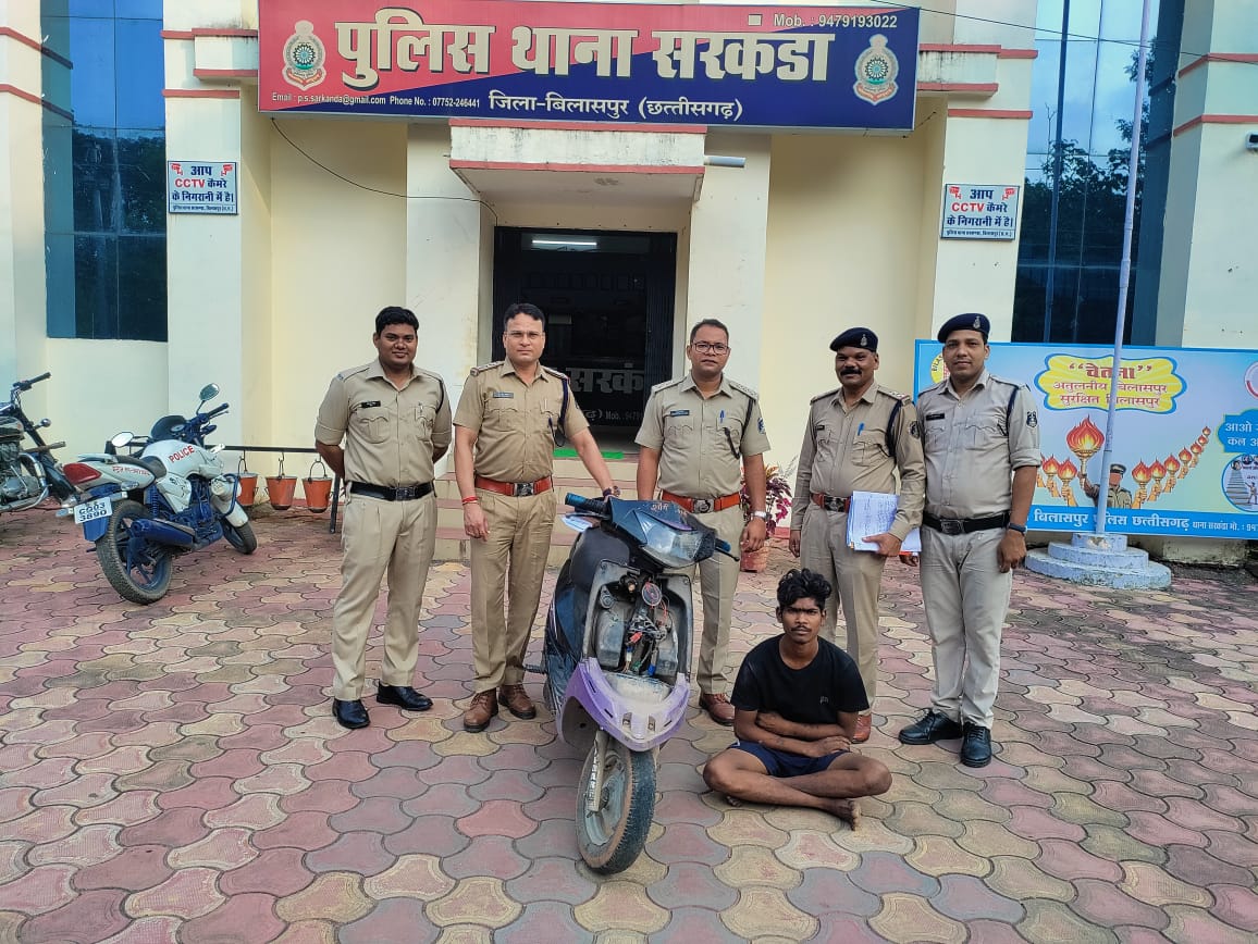 घर के सामने से स्कूटी पार करने वाले चोर जबड़ा पारा मुक्ति धाम चौक निवासी राजा वस्त्रकर को सरकंडा पुलिस ने पकड़ा है। पथरिया निवासी शैलेंद्र शर्मा मुक्तिधाम सरकंडा के पीछे किराया का मकान लेकर रहता है। 6 अक्टूबर की रात उसने अपनी काले रंग की स्कूटी घर के बाहर खड़ी की थी। रात में कोई अज्ञात चोर उसे चोरी कर ले गया, जिसकी रिपोर्ट थाने में की गई थी। पुलिस को सूचना मिली कि राजा वस्त्रकर उर्फ बॉय नाम का लड़का चोरी के काले रंग की स्कूटी में घूम रहा है। इसके बाद सरकंडा पुलिस ने घेराबंदी कर उसे पकड़ तो उसके पास से शैलेंद्र शर्मा की स्कूटी बरामद हुई। पुलिस ने स्कूटी जप्त कर आरोपी चोर को गिरफ्तार कर लिया है।