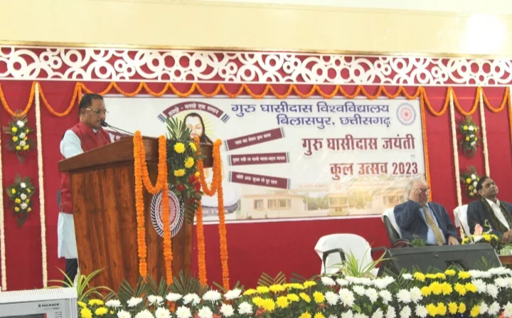 मुख्यमंत्री श्री साय ने बाबा घासीदास जयंती की सभी को शुभकामनाएं दी। उन्होंने कहा कि मुख्यमंत्री बनने के बाद शैक्षणिक संस्थाओं के अंतर्गत घासीदास विश्वविद्यालय में पहला कार्यक्रम बना है। विशाल स्तर पर जयंती समारोह आयोजित करने के लिए विश्वविद्यालय प्रबंधन को बधाई दी। श्री साय ने कहा कि 18 वीं सदी में देश में सामाजिक भेदभाव एवं छूआछूत की भावना चरम पर थी। समाज में ऊंच-नीच की भावना गहराई लिए थी। ऐसी हालात में बाबा घासीदास जी का अवतरण हुआ। उन्हेांने मनखे-मनखे एक समान का उपदेश देकर सामाजिक समरसता का सूत्रपात किया। हमें गर्व है कि बाबा घासीदास जी के नाम पर पूरे देश का एकमात्र विश्वविद्यालय है। मुख्यमंत्री श्री साय ने कहा कि बाबा के आशीर्वाद एवं जनता के सहयोग से छत्तीसगढ़ को और समृद्ध राज्य बनाएंगे। प्रकृति ने छत्तीसगढ़ की भूमि को उर्वरा बनाया है। खनिज एवं वन ससंाधनों की बहुलता है। छत्तीसगढ़ को देश का नम्बर वन राज्य बनाने के लिए संसाधनों की कोई कमी नहीं होगी। उन्होंने शिक्षा के साथ-साथ सामाजिक सरोकारों के अन्य प्रकल्पों पर काम के लिए विश्वविद्यालय की सराहना की। मुख्यमंत्री ने जयंती के अवसर पर कॉलेज के एनएसएस ईकाई द्वारा ब्लड डोनेशन कैम्प का शुभारंभ किया। 2 सौ यूनिट ब्लड संकलन का लक्ष्य इस शिविर में रखा गया है। मुख्यमंत्री ने विश्वविद्यालय में बच्चों के लिए संचालित सस्ते केन्टीन की प्रशंसा की। मात्र 10 रूपये में बच्चों को भरपेट एवं गुणवत्ता पूर्ण भोजन परोसी जाती है। फिलहाल 600 बच्चे इस योजना का लाभ उठा रहे हैं। मुख्यमंत्री ने घासीदास विश्वविद्यालय का राजधानी में विस्तार के लिए पूर्ण सहयोग का भरोसा दिलाया।