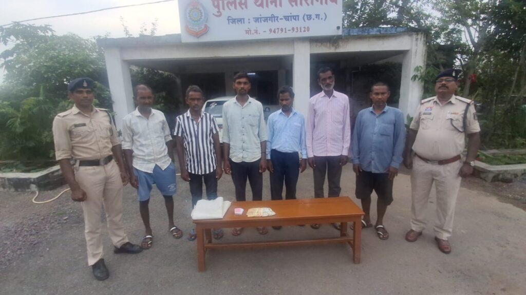 जांजगीर-चांपा थाना सारागांव पुलिस ने ग्राम मोहगांव में जुआ खेलते छह व्यक्तियों को गिरफ्तार किया। उनके कब्जे से नगदी 6080/- रुपये और ताश पत्ती बरामद की गई। गिरफ्तार आरोपियों के खिलाफ जुआ प्रतिषेध अधिनियम के तहत कानूनी कार्रवाई की गई।पुलिस अधीक्षक जांजगीर-चांपा विजय कुमार पाण्डेय के निर्देशन में और अतिरिक्त पुलिस अधीक्षक श्री उमेश कुमार कश्यप तथा SDOP चांपा श्री यदुमणी सिदार के नेतृत्व में यह कार्रवाई की गई। इस सफलता में थाना प्रभारी सारागांव सुभाष चौबे, ASI के. के. कोशले, आरक्षक दीपक ठाकुर, जय किशन और ईश्वर पटेल का विशेष योगदान रहा।