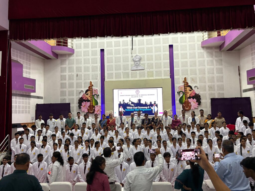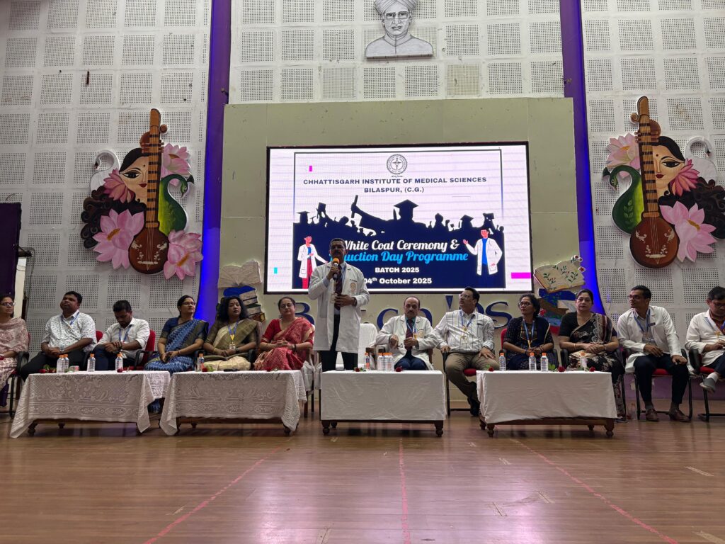 सिम्स, बिलासपुर में एमबीबीएस बैच 2025-26 के लिए इंडक्शन डे और वाइट कोट सेरेमनी 4 अक्टूबर को उत्साहपूर्वक आयोजित की गई। कार्यक्रम का शुभारंभ दीप प्रज्वलन और सरस्वती वंदना से हुआ, और नए छात्रों का स्वागत सहायक स्टूडेंट सेल प्रभारी डॉ. सचिन पांडेय ने किया।डीन डॉ. रमणेश मूर्ति ने अपने संबोधन में छात्रों को बधाई दी और वाइट कोट को सेवा, संवेदना और जिम्मेदारी का प्रतीक बताया।