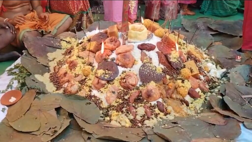 देवी को अर्पित करने के लिए विशाल आकार के 21 प्रकार के व्यंजन तैयार किए गए थे जिसमें इडली, दोसा बड़ा, चंद्रकांतालु, पुलियाराम, चना, गुलगुला और अन्य प्रकार के पकवान थे। गाजे बाजे, डफली और आतिशबाजी के साथ इस भोग प्रसाद को लेकर श्रद्धालु पूजा पंडाल पहुंचे, जहां पुजारी ने देवी के समक्ष आसन लगाकर उन्हें यही महाभोग अर्पित किया।