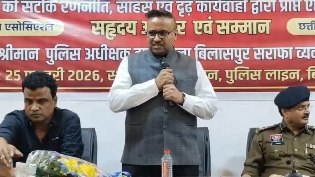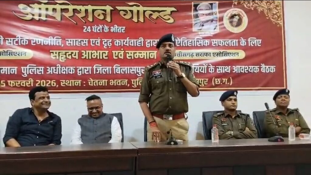 बिलासपुर राजकिशोरनगर स्थित महालक्ष्मी ज्वेलर्स में हुई बड़ी लूट और उसके कुछ दिनों बाद सीपत में घटी घटना को देखते हुए सुरक्षा व्यवस्था को लेकर पुलिस ने सख्त रुख अपनाया है। इसी कड़ी में एसएसपी रजनेश सिंह ने बिलासा गुड़ी स्थित चेतना हॉल में सराफा व्यापारियों की बैठक ली। बैठक में व्यापारियों को सुरक्षा के आवश्यक मानकों और सतर्कता संबंधी उपायों की विस्तृत जानकारी दी गई।